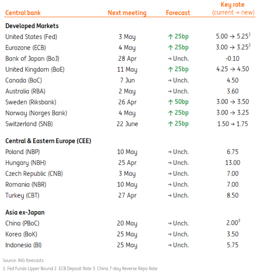 ING 그룹 (ING Groep)은 네덜란드 암스테르담에 본사를 둔 다국적 금융 그룹입니다. ING그룹은 최근 각국 중앙은행의 행보가 과거 수십년 내 가장 드라마틱한 5월이 되리라 예상하며 보고서를 발행하였습니다. 5월이 되면, 공격적인 중앙은행 긴축 사이클이 막바지 단계에 접어들 것이며, 이것은 글로벌 중앙은행의 의사결정을 바라보는 시장의 주요 쟁점이 될 것입니다.