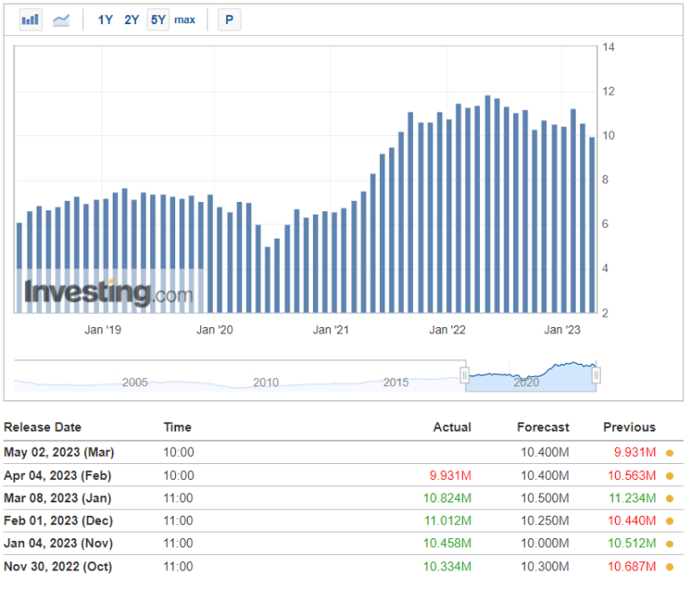 월간 구인 및 노동 이직 조사(JOLTS) 보고서에 따르면 노동 수요 지표는 632,000명 감소한 990만 명으로 2021년 5월 이후 최저치를 기록했으며 이는 노동 시장의 위축을 가리키기 시작했습니다. 미국의 일자리가 거의 2년 만에 최저치로 떨어졌고 공장 주문이 계속 감소하고 있다는 데이터는 금리 인상이 거의 끝날 수 있음을 나타내는 수치로 달러를 약화시켰습니다.
