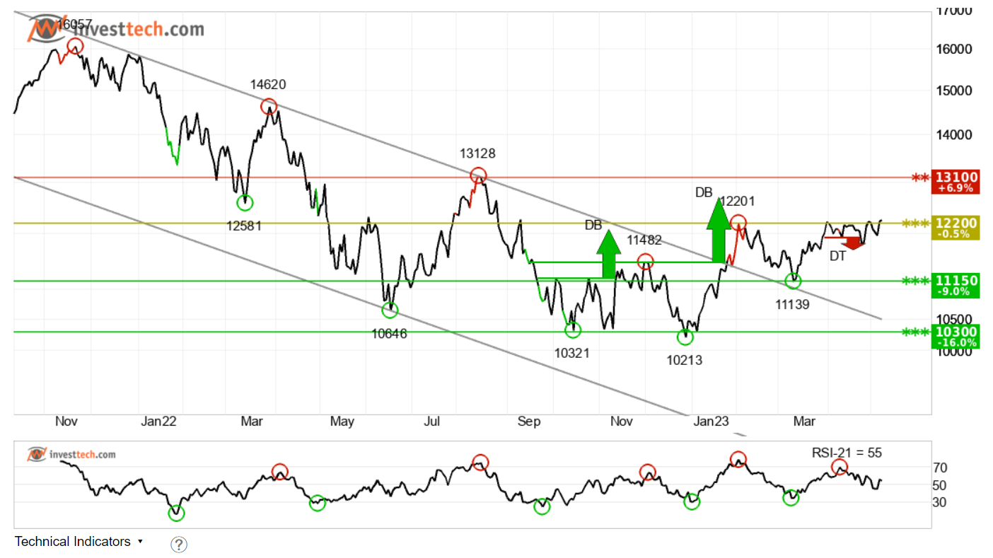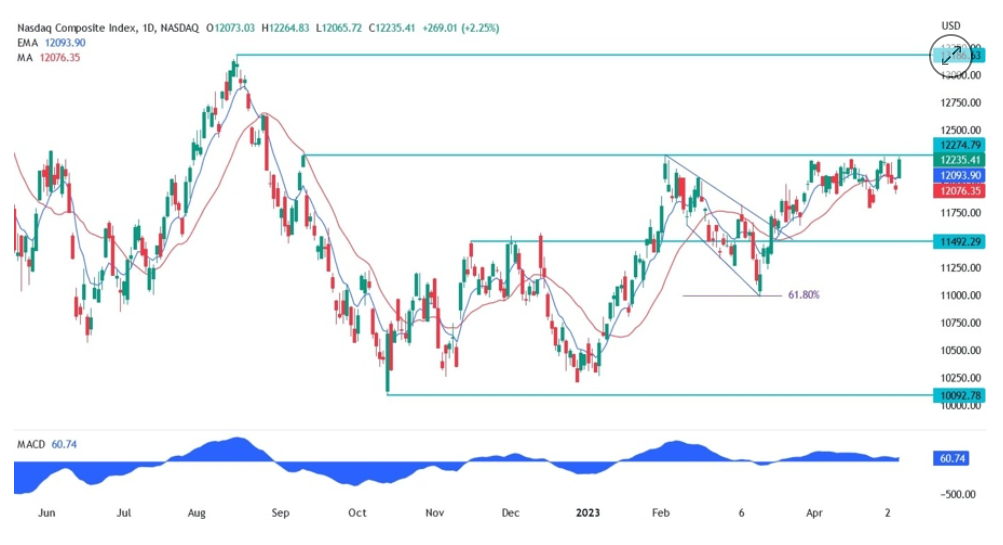 하단의 나스닥차트에서 시장이 12274 저항선을 넘어서기 위해 계속 노력하고 있음을 알 수 있습니다. 금요일의 강력한 NFP 보고서는 인플레이션의 완화, 회복력 있는 노동 시장, 그리고 연준이 6월에 일시 중단하고 금리를 인하할 것으로 예상됨에 따라 시장에 연착륙 분위기를 주었습니다. 매수자들은 여전히 지난 2월 조성된 대형 강세의 연장선인 13000선을 목표로 하고 있습니다.
